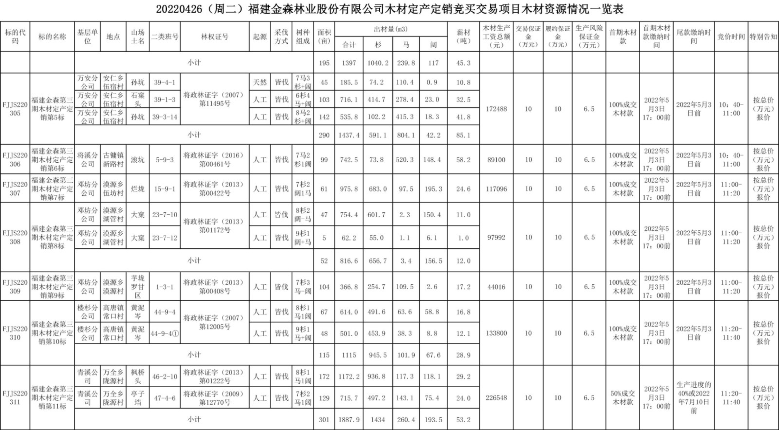| FJJS220301 | 第三期木材定產(chǎn)定銷第1標 | 259 | 2791.9 | 69.7 | 20萬元 | 10:00-10:20 | 按總價 (萬元) 報價 |