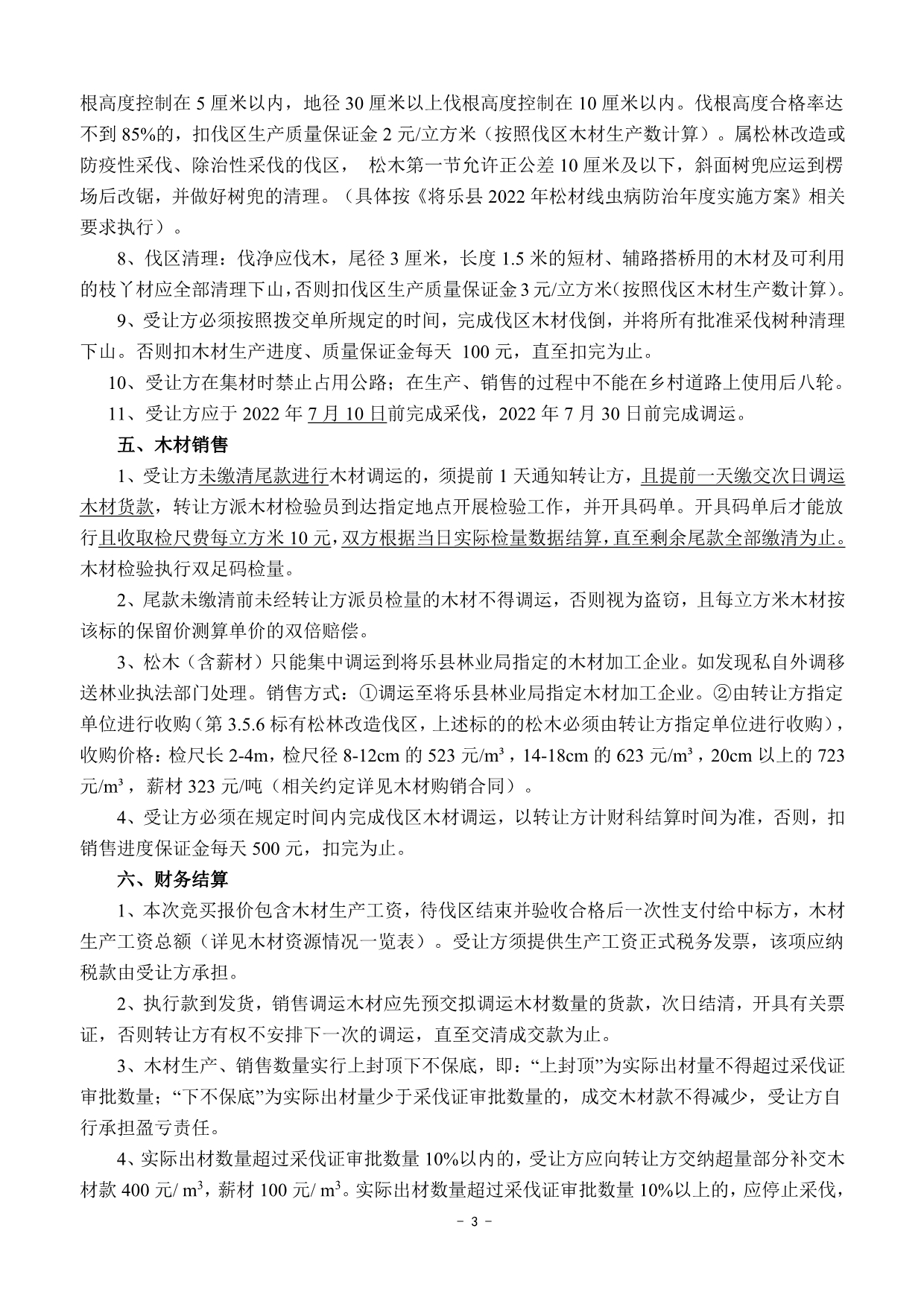 重要信息披露 | 1、標的簡介所列的出材量等數(shù)據(jù)僅供參考,標的以現(xiàn)狀交付,轉(zhuǎn)讓方及交易中心不承擔標的面積與實測面積、標的出材量與實際出材量差異等責任,不調(diào)整相應的成交價格。 2、本次競買報價包含木材生產(chǎn)工資,木材生產(chǎn)工資總額詳見木材資源情況一覽表,待伐區(qū)結束并驗收后一次性支付給受讓方。 3、銷售費用、成交后發(fā)生的政策變化費用、稅收均由受讓方承擔。 4、松木(含薪材)只能集中調(diào)運到將樂縣林業(yè)局指定的木材加工企業(yè)。如發(fā)現(xiàn)私自外調(diào)的,將移送林業(yè)執(zhí)法部門處理。銷售方式:①調(diào)運至將樂縣林業(yè)局指定木材加工企業(yè)。②由轉(zhuǎn)讓方指定單位進行收購(第3.5.6標中有松木改造伐區(qū),上述標的的松木必須由轉(zhuǎn)讓方指定單位進行收購)(相關約定詳見木材購銷合同)。 5、受讓方應于2022年7月10日前完成采伐,2022年7月30日前完成調(diào)運。 6、本次交易第1標和第2標木材運輸需經(jīng)過木材建造的花橋,限載4m,同時,第1標伐區(qū)道路開設需經(jīng)過軍用光纜,道路開設時應避開。第4標寺許村伐區(qū)運輸需經(jīng)過高速公路底下涵洞,限高限載6m3,吳厝地村伐區(qū)道路開設需經(jīng)過電站的水管。一旦參與交易表明意向受讓方已認可并接受該風險,由該風險產(chǎn)生的一切后果和費用由意向受讓方承擔。 7、未盡事宜詳見木材資源情況一覽表、競買約定、木材生產(chǎn)承包合同(范本)、木材購銷合同(范本)、伐區(qū)位置示意圖等本公告其他附件。 | ||