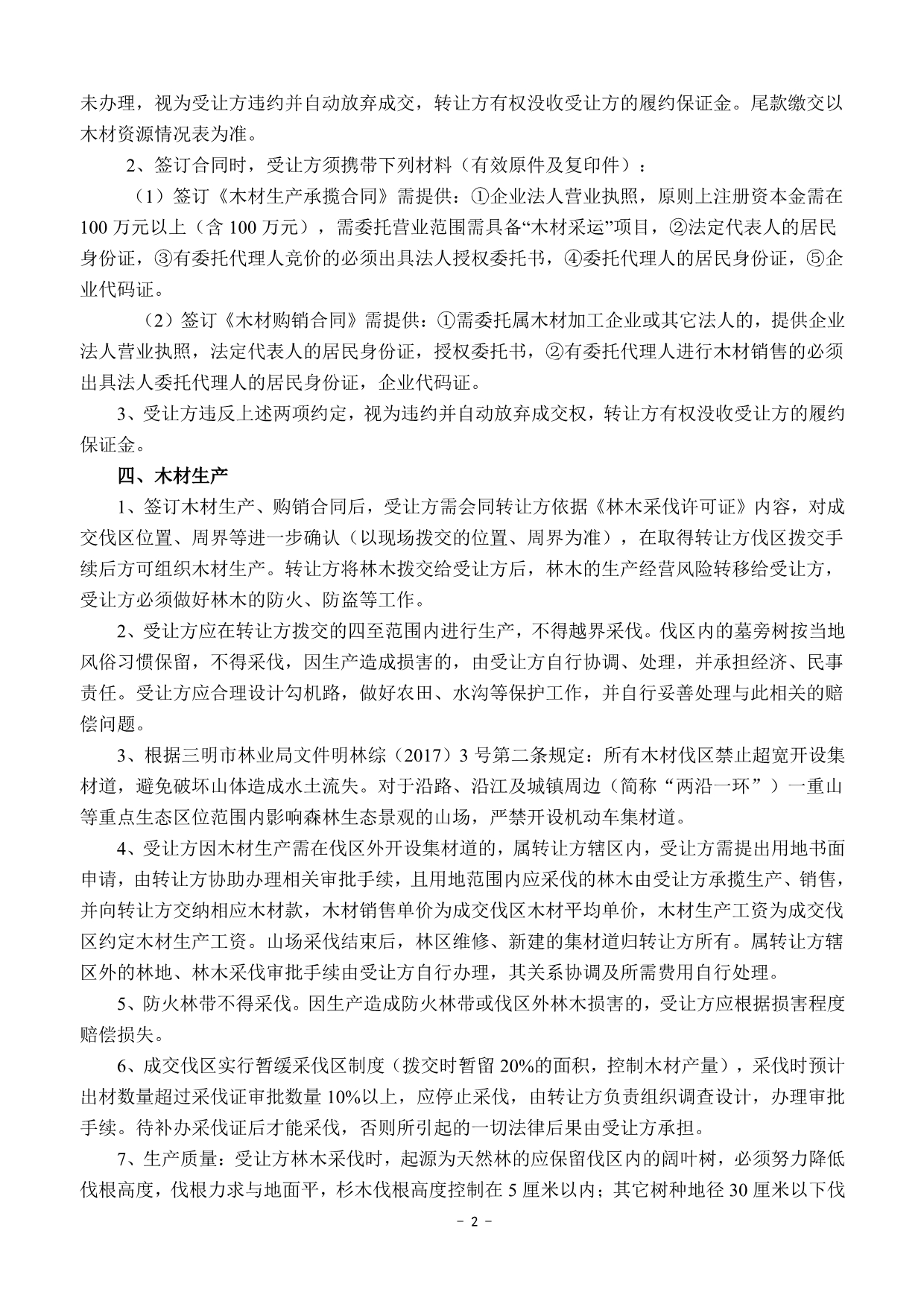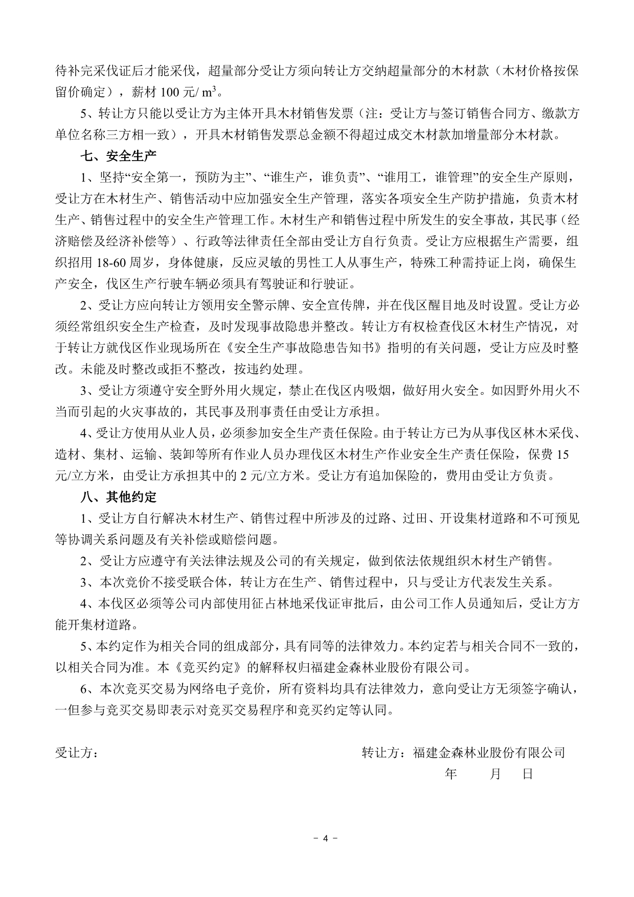成交確認、價款支付及合同簽訂 | 1 .成交后的兩個工作日內(nèi)受讓方以微信、郵箱等方式收到《成交通知書》掃描件或電話通知;若受讓方未及時收到成交通知書的,請主動與轉(zhuǎn)讓方聯(lián)系。 2.價款交納日期及方式:成交后,受讓方須于2022年5月3日17:00前將首期木材款(詳見木材資源情況一覽表)及每標生產(chǎn)風險保證金6.5萬元(含木材生產(chǎn)進度、質(zhì)量保證金3萬元;銷售進度保證金1.5萬元;安全生產(chǎn)保證金2萬元)轉(zhuǎn)入轉(zhuǎn)讓方指定銀行賬戶,并與轉(zhuǎn)讓方簽訂《木材生產(chǎn)承攬合同》和《木材購銷合同》。尾款交付方式以木材資源情況一覽表為準。 轉(zhuǎn)讓方指定銀行賬戶如下: 戶名:福建金森林業(yè)股份有限公司 開戶銀行:福建將樂成功村鎮(zhèn)銀行股份有限公司 賬號:9031510010010000033058 3.受讓方不依據(jù)本公告的要求履約的,視為自動放棄受讓資格,其已交納的交易保證金不予退回,并對交易中心因此造成的損失承擔賠償責任,轉(zhuǎn)讓方有權將該標的重新組織競買交易。 | ||