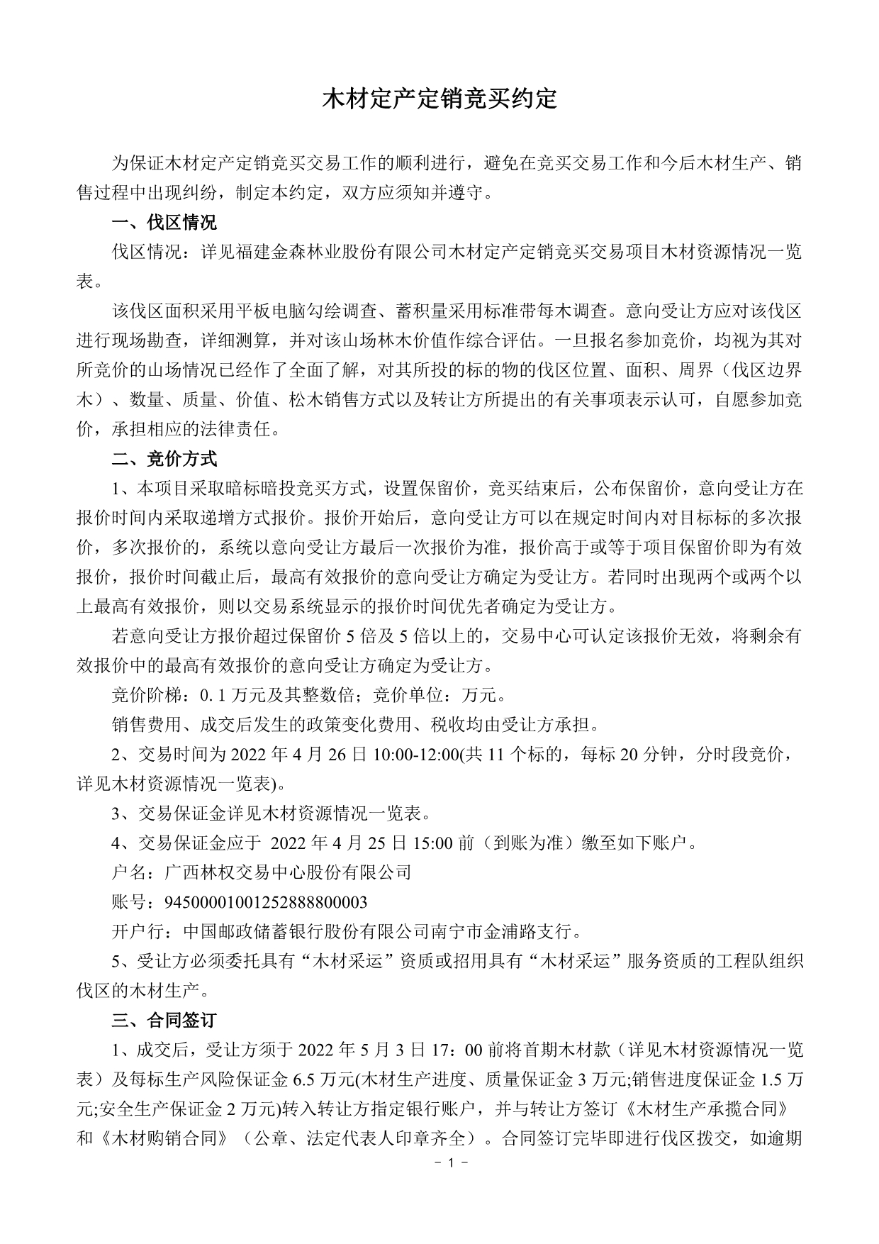 保證金及 處理方式 | 1.須交納的交易保證金詳見木材資源情況一覽表。 2.交易保證金應于2022年4月25日15:00前(到賬為準)繳至如下賬戶: 戶名:廣西林權交易中心股份有限公司 賬號:94500001001252888800003 開戶行:中國郵政儲蓄銀行股份有限公司南寧市金浦路支行 注: ①交易保證金只接受銀行柜臺、網(wǎng)銀、電匯轉(zhuǎn)賬,不接受ATM轉(zhuǎn)賬、現(xiàn)金繳款; ②交易保證金轉(zhuǎn)賬單上須注明參與競拍哪一標的保證金 (如:0426金森1標保證金)。 3. 交易成交,在收到交易雙方出具的《款項收訖及正式書面合同簽訂確認函》后的5個工作日內(nèi),受讓方已交納的交易保證金由交易中心直接轉(zhuǎn)到福建金森林業(yè)股份有限公司指定銀行賬戶充抵履約保證金。 4.交易成交,受讓方如未按本公告約定與轉(zhuǎn)讓方簽訂成交文件的,或違反交易中心交易規(guī)則的,其已交納的交易保證金將不予返還; 5.未成交者的交易保證金交易中心將在交易結束后次日起3個工作日內(nèi)全額無息返還。 | ||
